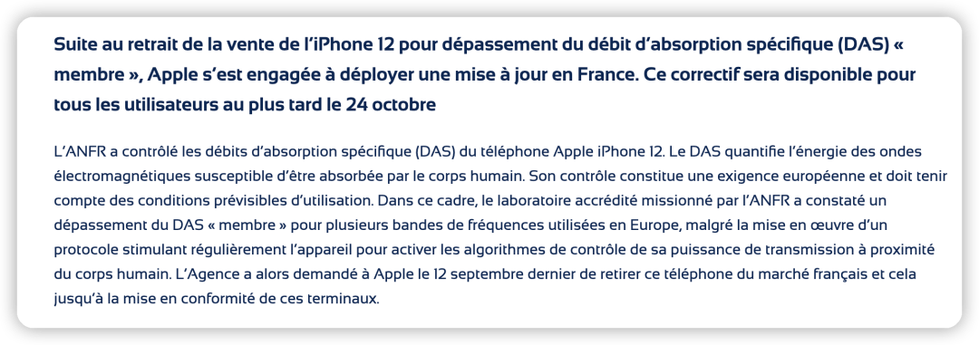 前段时间,法国检测机构公布了 iPhone 12 辐射超标的情况。
