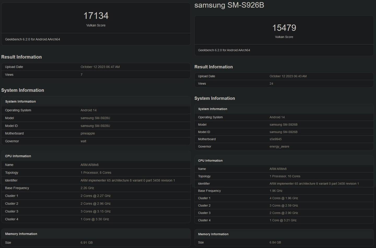 高通骁龙 8 Gen 3 for Galaxy 处理器采用 Adreno 750(暂定)GPU,在 Vulkan 中得分为 17314 分,Xclipse 940 得分为 15479 分,高出 10.7%。OpenCL 分数为 14,731 (Adreno 750) 和 14,908 (Xclipse 940)。