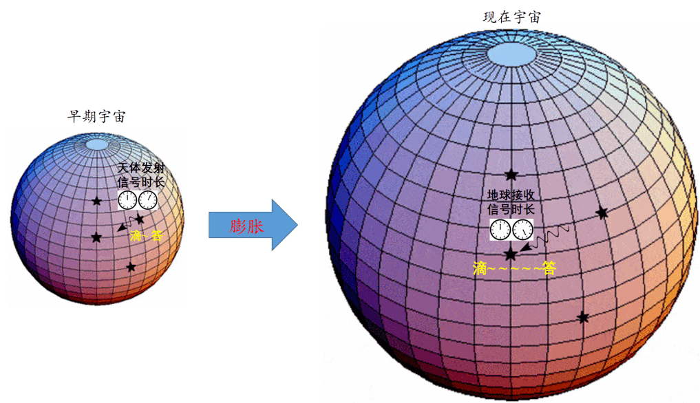 然而,这其实并非时间流逝的速度真的变快了,而是由于光信号在传播过程中,宇宙空间膨胀所导致的效应。