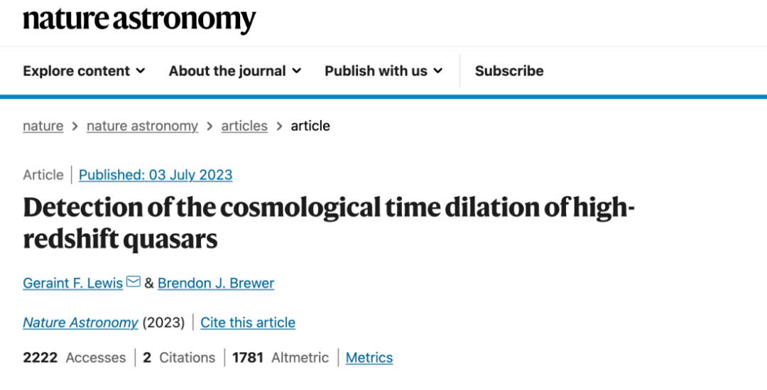 2023 年 7 月,悉尼大学和奥克兰大学两位天文学家,通过对来自宇宙早期(大爆炸后约 10 亿年)的类星体光变信号的监测分析,发现这些信号到达地球时的持续时间比其在宇宙早期产生时的持续时间延长了 5 倍。