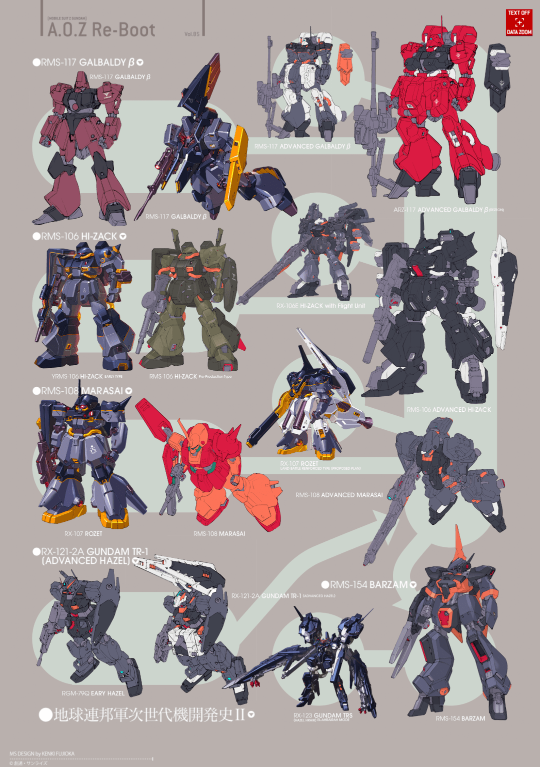 上面这张图展示了格里普斯战争初期地球联邦军和提坦斯的主力机体“加尔巴迪β”、“高扎古”、“马拉塞”以及它们的高级机体的发展历程。可以说,每台机体都与“TR计划”密切相关,并通过采用Transpack系统而具有通用性等功能。从"海兹尔adv"获得的数据在这些机体的研发中得到了体现。 经过验证的各种设备都被采用在每台高级机上。