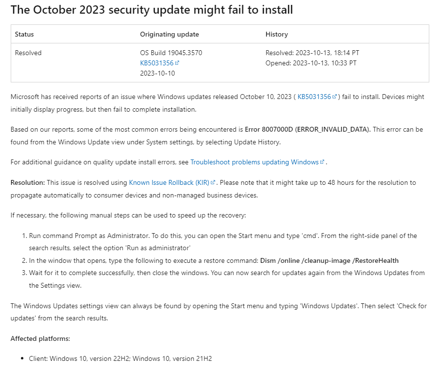 微软已收到有关 2023 年 10 月 10 日发布的 Windows 更新 (KB5031356) 无法安装的问题报告。设备初期可能会显示进度,但随后无法完成安装。