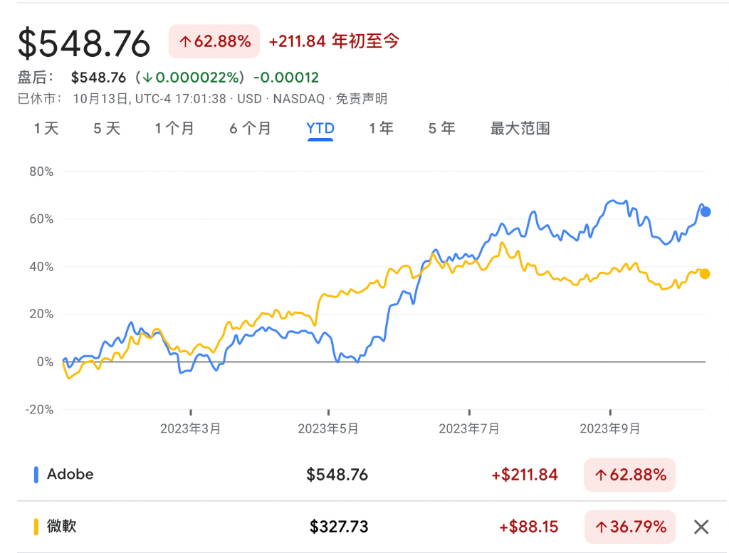 Adobe推出的Photoshop、Lightroom等多款软件,一直是许多创意人员日常工作必备工具。自从生成式AI兴起以来,Adobe持续开发优化软件的AI功能,在落实AI商业模式方面走到了前列。Adobe股价今年年初以来累计涨超62%,超过微软等AI领头羊。