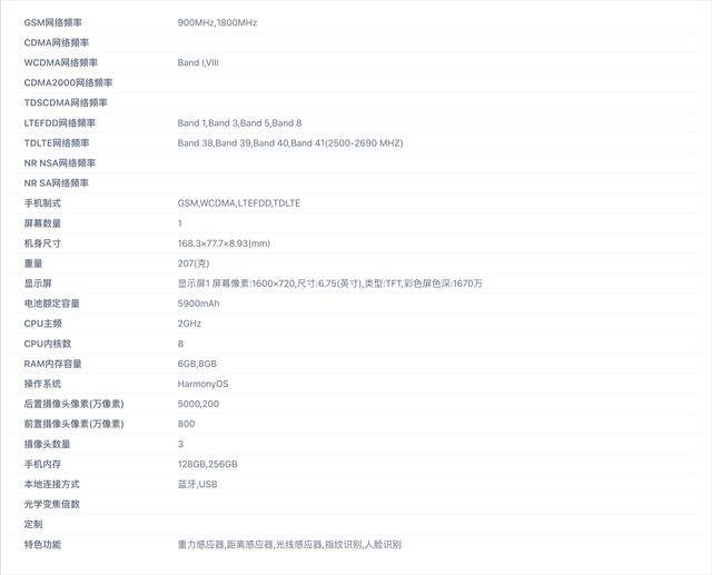 前置800万像素摄像头,后置5000万+200万双摄组合,相机模组可以参考华为P60系列,华为也开始将旗舰外观下放给千元机了。机身三围是168.3*77.7*8.93毫米,重207克,机身内置6000毫安时电池(额定容量是5900毫安时),出厂搭载鸿蒙OS操作系统。