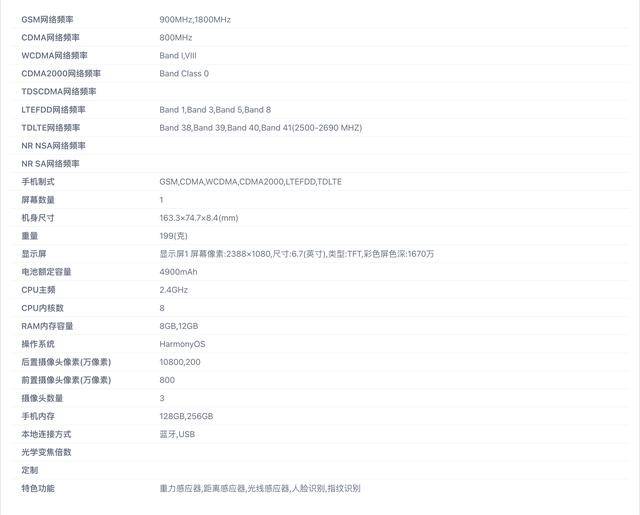 前置800万像素摄像头,支持人脸识别功能,后置1亿像素+200万像素双摄组合,不支持光学变焦功能。相机模组为居中奥利奥设计,可以参考华为Mate50系列或者畅享60X,其他两颗镜头位置是闪光灯和装饰品。机身三围是163.3*74.7*8.4毫米,重199克,出厂搭载鸿蒙OS操作系统。