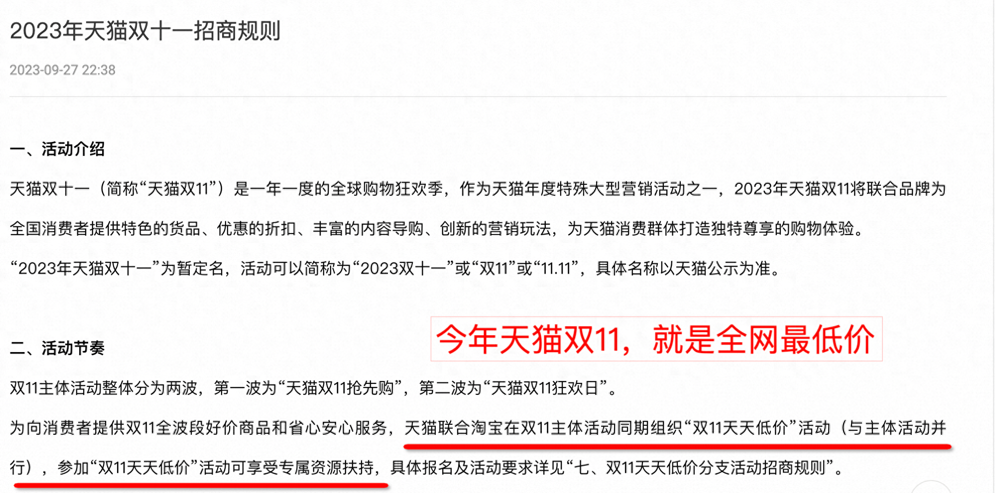 据天猫招商规则及部分内部人士透露,2023年天猫“双11”相比往年最大的不同,是在主体“双11”活动期内,同期新增了名为“双11天天低价”活动,对应打标商品将获加权流量。