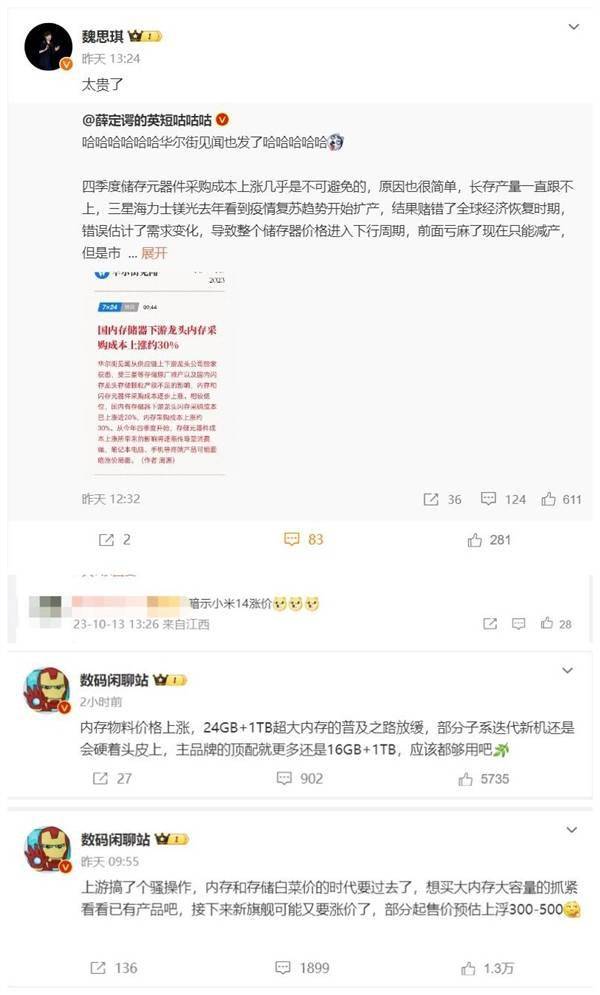 小米产品经理魏思琪转发了相关微博,表示“内存/存储太贵了”。对此,有网友在评论区留言:暗示小米14要涨价。