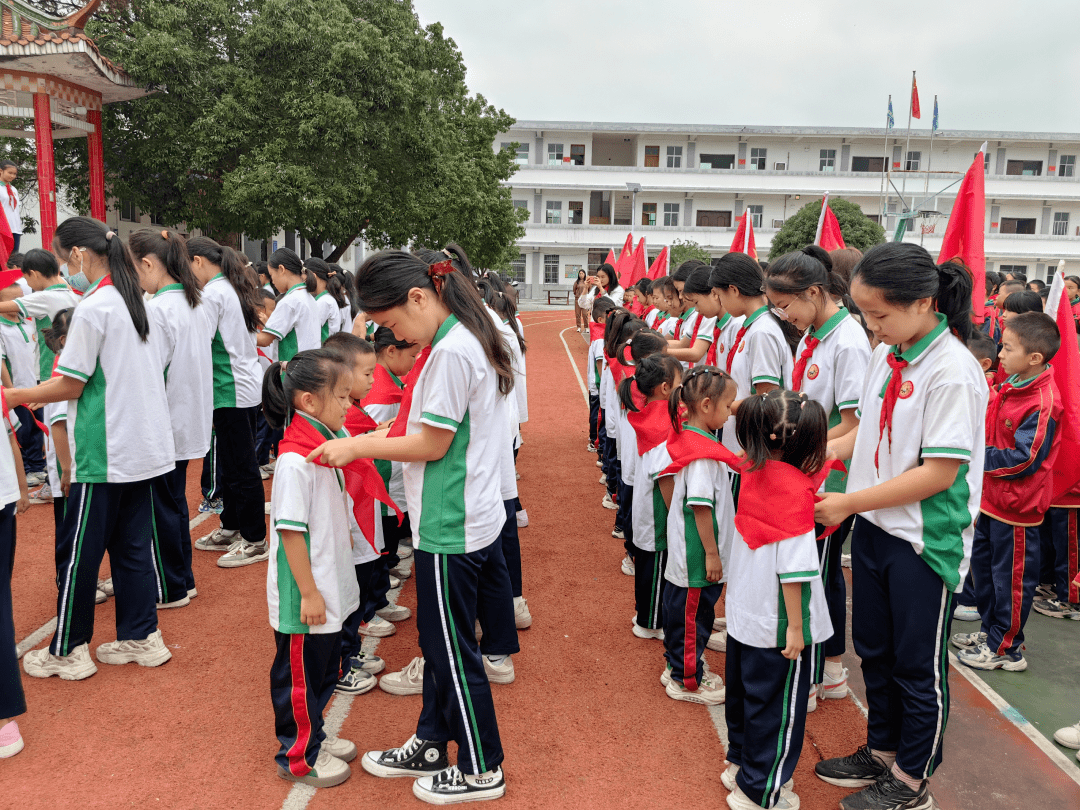 火红的队旗高高飘扬,星星火炬闪耀着金光,老少先队员为新队员佩戴红领巾,当鲜艳的红领巾佩带在他们的胸前时,新队员的脸上都洋溢着激动与自豪。在大队辅导员朱柳红老师的带领下,全体少先队员在队旗下光荣宣誓:时刻准备着为共产主义事业而奋斗! 洪亮的宣誓声和呼号声表达了队员们的责任与担当。辅导员王洁老师希望队员们勤奋学习,快乐生活、全面发展,从小听党话、跟党走,争做合格好队员。