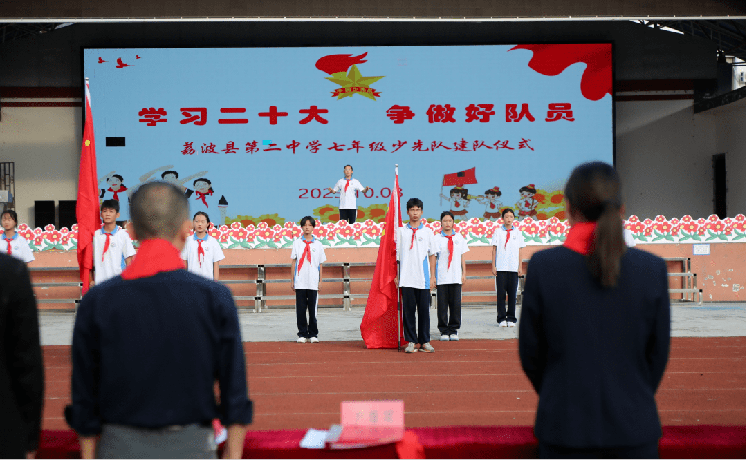 鲜艳的红领巾在胸前飘扬,星星火炬指引我们方向。伴随着祖国坚定前行的步伐,中国少年先锋队走过74年的光辉历程,一路追随,一路成长。为深入学习贯彻党的二十大精神,教育引导广大少先队员听党话、跟党走,增强少先队员和辅导员的光荣感和组织归属感,用实际行动践行“请党放心,强国有我”的铮铮誓言,10月8日下午,荔波县第二中学隆重举行了“学习二十大·争做好队员”七年级少先队建队仪式。与会领导有团县委挂职副书记潘柳蒙、校少工委主任、校长尹维斌、学校行政领导,参加了本次建队仪式。