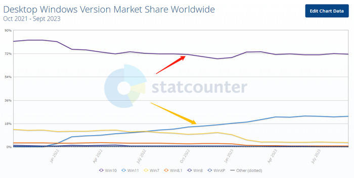 如图所示,红色箭头所指紫色线代表Windows 10系统,黄色箭头所指蓝色线代表Windows 11系统,从Windows 11系统发布的2021年10月至2023年9月的近两年时间里,Windows 11系统市占率虽然有着一定的增长,但很明显依旧无法撼动Windows 10系统的地位,尤其从2022年5月起,Windows 10系统市占率一直保持在70%左右上下浮动,Windows 11系统蚕食的可能只是Windows 7/8系统的市场份额。