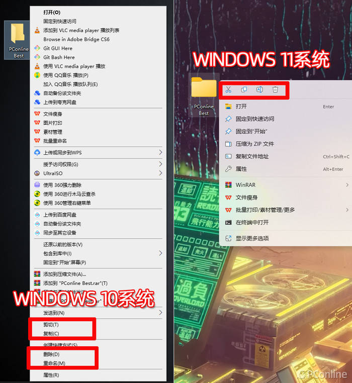 重命名/复制/粘贴/剪切,这都是比较常用的功能,虽然Windows 11系统并没有像“刷新”功能那样,给这些功能设置两步操作,但却将其从文字描述更改为图标展示。