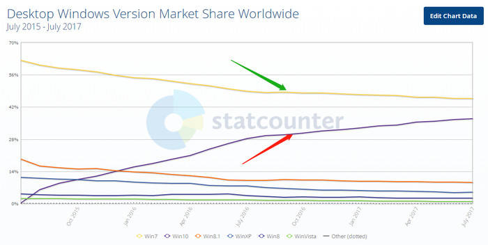 到2017年10月,Windows 10系统市占率达到41.69%,而Windows 7系统市占率为41.89%,也基本是在这个时间点,Windows 10系统超越了Windows 7系统,成为了市占率最高的Windows系统,用时大约为2年5个月。