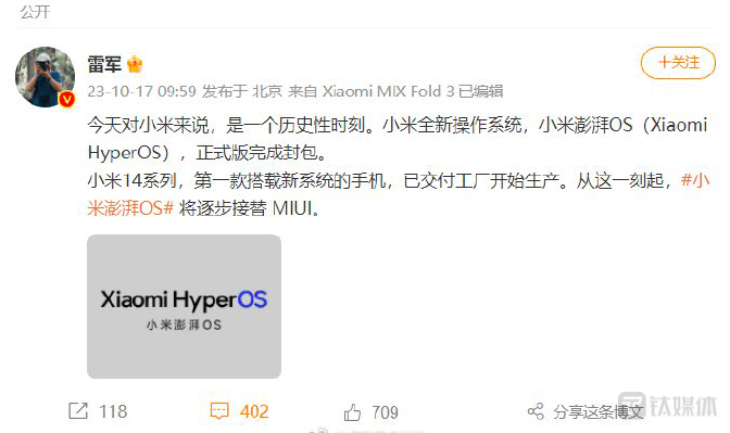钛媒体App 10月17日消息,雷军在个人微博宣布小米全新的操作系统,小米澎湃OS(Xiaomi HyperOS),正式版已完成封包。新操作系统未来将逐步替代现有的MIUI系统。同时小米14系列将是第一款搭载新系统的手机,目前已进入量产阶段,即将发布。