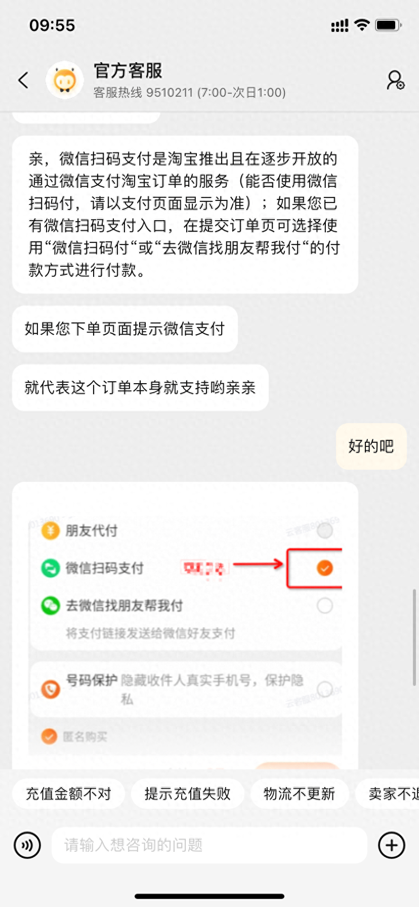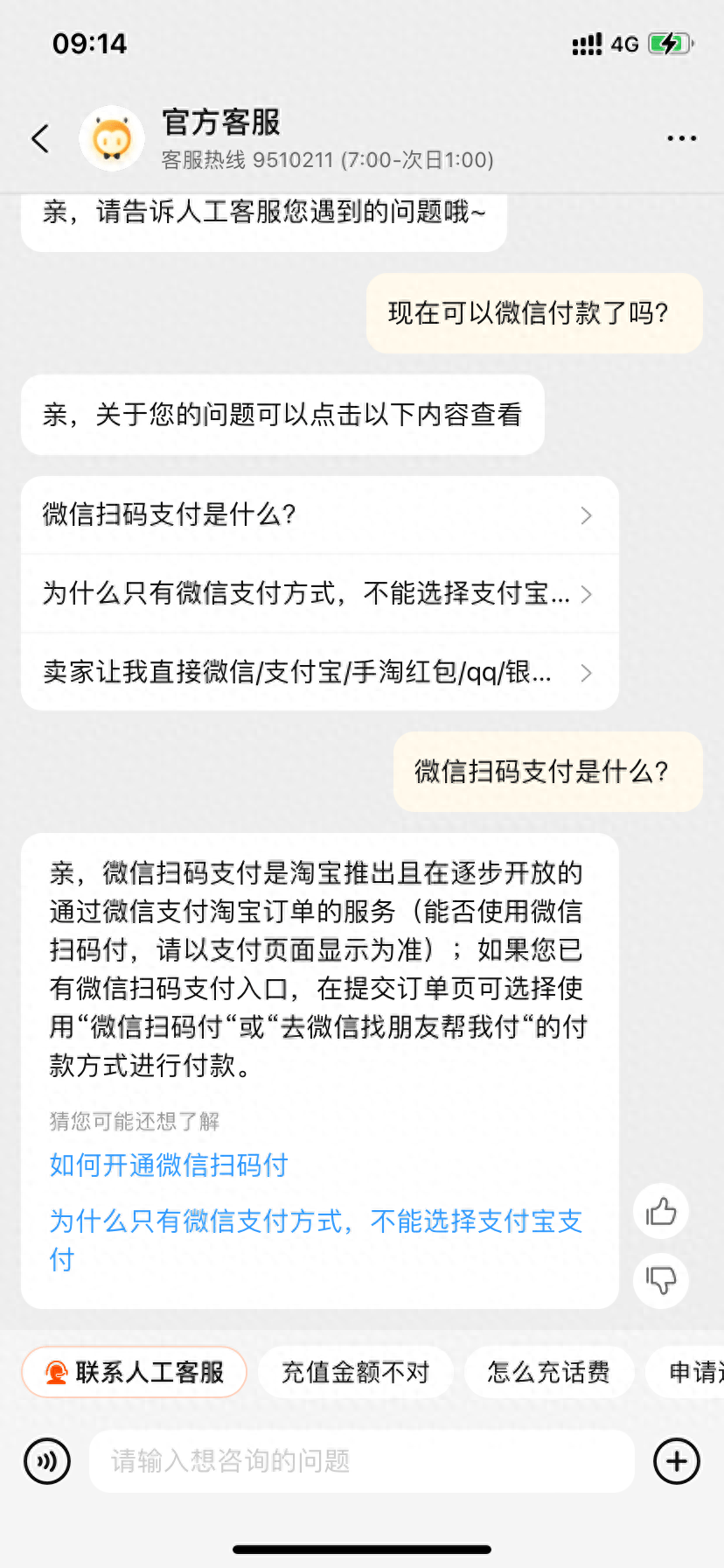 10月18日,记者先在淘宝实验了支付程序并未出现“微信扫码支付”选项。对此,淘宝官方客服人员表示,微信扫码支付是淘宝推出且在逐步开放的通过微信支付淘宝订单的服务(能否使用微信扫码付,请以支付页面显示为准);如果您已有微信扫码支付入口,在提交订单时可选择使用“微信扫码付”或“去微信找朋友帮我付”的付款方式进行付款。