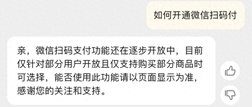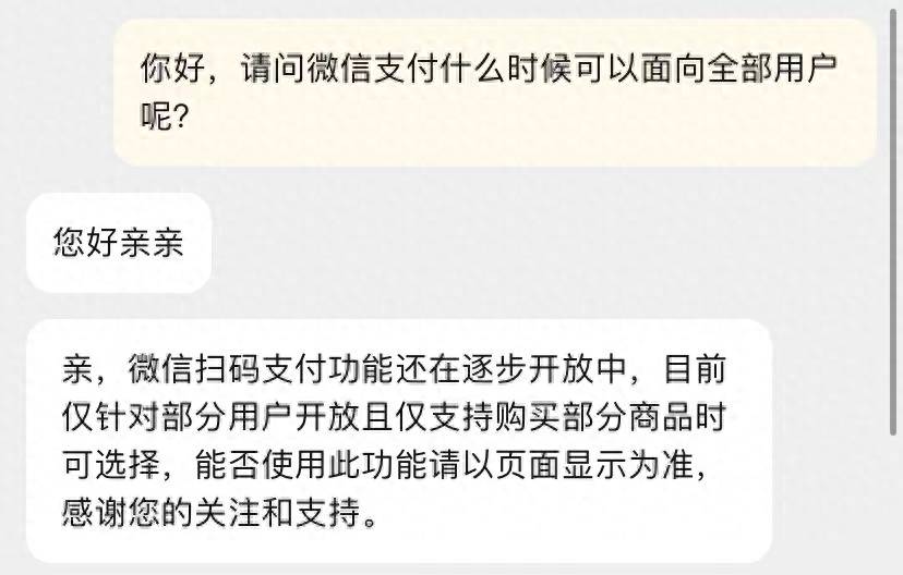 同时,客服人员还表示微信扫码支付功能均为随机选择无需申请,如果没有出现微信支付的结算页面,一般是订单本身没有微信支付方式。对于什么时候会面向全部用户开放,客服人员说:“目前未接到相关通知。”