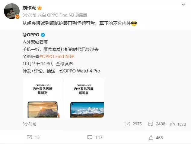 明天就是OPPO Find N3正式发布的日子,而从目前新推出的折叠屏手机来看,无论在性能上,还是在影像上,对于一款折叠屏手机来说,比较吸引消费者关注的基础还是这块屏。而日前,在 @OPPO 的官宣中,似乎也把主要精力放到了这块评上。继昨日,官宣称,OPPO Find N3屏幕不分内外,超明亮、超可靠之外,日前,官方再次官宣称,该机将以大到超越物理所限的体验,重构大屏交互。OPPO首席产品官 一加创始人 @刘作虎 则表示,“真的不分内外”“大到出界”。
