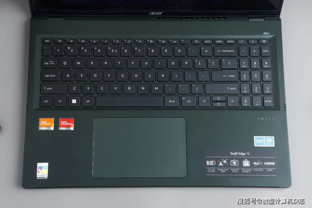宏碁传奇Edge 16采用全尺寸白色背光键盘,键盘键距较宽,按键回弹力度适中,打字输入非常舒适。值得一提的是,相比前代产品,这台机器还新增了数字小键盘设计,这很好地解决了大多数用户办公或者平时使用时频繁输入数字不便的痛点。