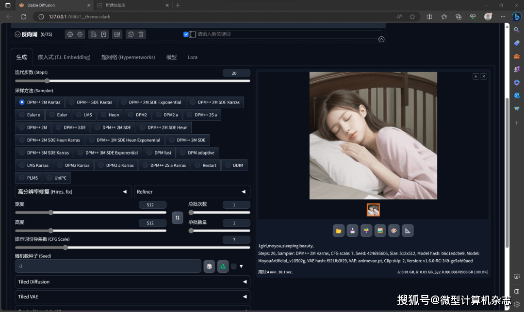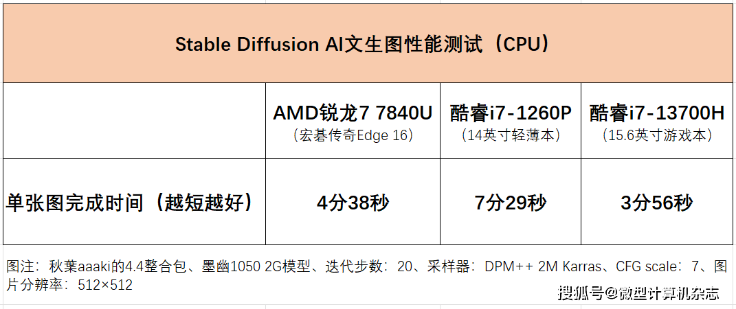 在AI应用领域,基于Stable Diffusion深度学习文本到图像生成模型的应用已经大火,我们通过它来简单测试下有着Ryzen AI引擎加持的锐龙7 7840U处理器的AI文生图性能表现。我们用B站秋葉aaaki的4.4整合包,通过墨幽1050 2G模型基于处理器来做Stable Diffusion文生图的测试,具体设置为迭代步数:20、采样器:DPM++ 2M Karras、CFG scale:7、图片分辨率:512×512。