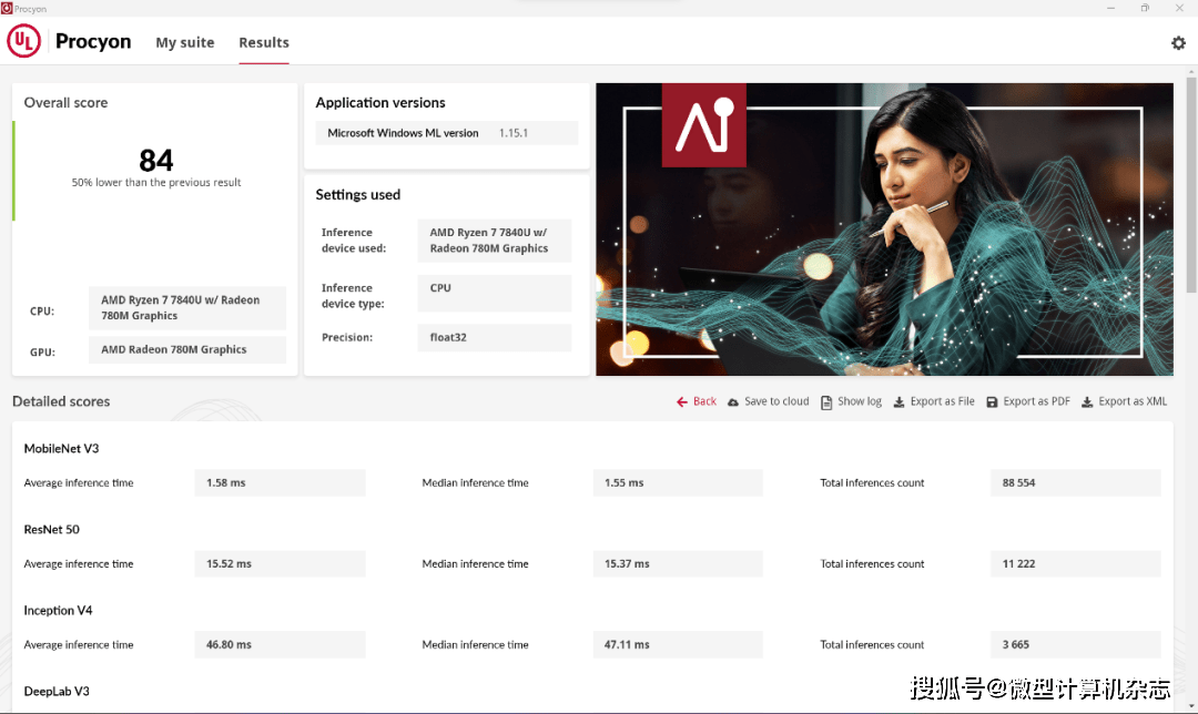 接下来看看加持Ryzen AI引擎的锐龙7 7840U处理器的AI性能表现。在UL Procyon的处理器AI测试中(基于Microsoft Windows ML SDK),宏碁传奇Edge 16在单精项目(FT32)上得到84分。我们之前测试的14英寸的酷睿i7-1355U机型在这个测试中的成绩仅为54分,相比之下宏碁传奇Edge 16领先大约56%,这背后Ryzen AI引擎功不可没。