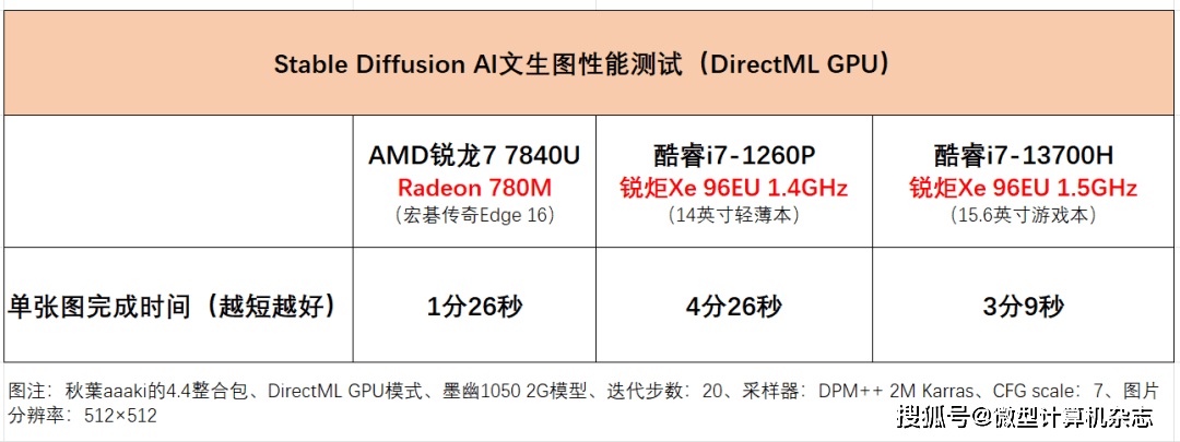 可以看到,用集显来加速的话,对比的两款锐炬Xe集显在Stable Diffusion中的出图速度都明显落后于锐龙7 7840U内置的Radeon 780M,即便是第13代酷睿游戏本标压处理器内置的锐炬Xe集显,它在这个测试中也落后于Radeon 780M。也就是说在Stable Diffusion中,宏碁传奇Edge 16的出图速度能够碾压搭载酷睿H系列标压处理器的集显轻薄本。