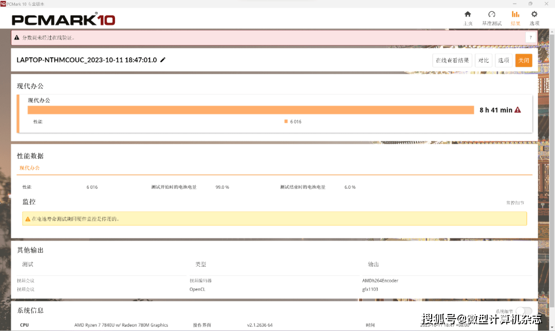 宏碁传奇Edge 16采用54Wh电池,再加上16英寸高亮度的大屏幕,这台机器的电池续航能力会不会“拖后腿”呢?我们在飞行模式、安静散热模式、最佳能效,50%屏幕亮度(HDR关)、20%扬声器音量下通过PCMark 10来测试一番。最终这台机器在PCMark 10的“现代办公”场景下得到8小时41分钟的续航成绩,值得注意的是测试结束时电池还剩下6%的电量。从续航成绩来看,这台机器的电池续航表现能满足用户不插电工作一天的办公需求,表现还是不错的。