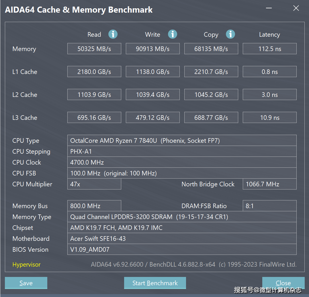 与处理器搭配的还有16GB LPDDR5 6400双通道内存以及512GB PCIe 4.0 SSD。在AIDA64软件的内存与缓存测试中,这台机器的内存读取速度达到50325MB/s,写入速度达到90913MB/s,延迟为112.5ns,表现不错。