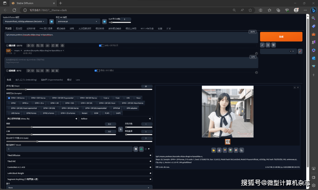 那么通过集显加速用Stable Diffusion来做文生图,宏碁传奇Edge 16的表现怎么样呢?我们再度用B站秋葉aaaki发布的Stable Diffusion通用4.4整合包,它支持通过DirectML调用集显来出图。测试中,我们依然基于墨幽1050 2G模型,具体设置为迭代步数:20、采样器:DPM++ 2M Karras、CFG scale:7、图片分辨率:512×512。