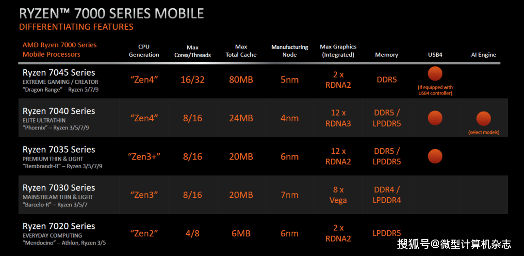 AMD今年推出的锐龙7000系列移动处理器涵盖锐龙7045、锐龙7040、锐龙7035、锐龙7030、锐龙7020等5大系列产品,它们分别采用了不同的核心架构以及生产工艺,并有着不同的产品定位。比如规格上最顶级的是锐龙7045HX系列产品,它采用Zen 4架构、5nm生产工艺,基础功耗为55W+。而从生产工艺以及最尖端的技术层面来看,最吸引人的是锐龙7040系列产品,该系列产品采用目前笔记本处理器领域最先进的4nm制造工艺,并配有Ryzen AI引擎,该系列产品真正代表目前x86阵营笔记本的最先进水平。前段时间,搭载锐龙7040HS和锐龙7040H系列处理器的笔记本相继上市,用户通过它们感受到了Ryzen AI的美妙。不过针对轻薄本的低压锐龙7040U系列处理器并未现身,现在它终于来了。