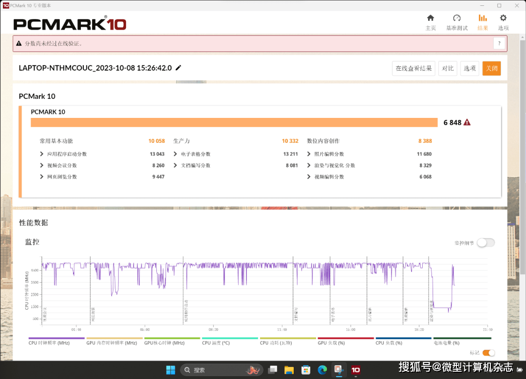最后来看看宏碁传奇Edge 16的整机综合性能表现。在PCMark 10基准测试中,这台机器得到6848的总分,其中“常用基本功能”“生产力”“数位内容创作”三个子项目的总分分别为10058、10332、8388分,表明这台机器具备相当强劲的整机性能,无论是日常应用还是办公、中轻度创作,它都能轻松应对。