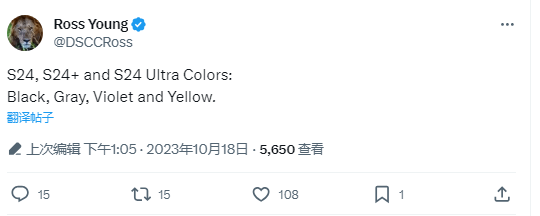 IT之家 10 月 18 日消息,屏幕供应链咨询公司 DSCC 首席执行官罗斯・杨(Ross Young)在最新推文中表示,三星 Galaxy S24 系列机型会有黑色、灰色、紫色和黄色四种颜色。