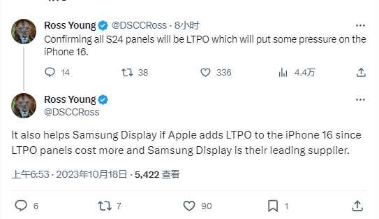 罗斯・杨还确认了今天早上的爆料,也认为 Galaxy S24 全系配备 M13 LTPO 面板,可能会给苹果 iPhone 16 施加一些压力。