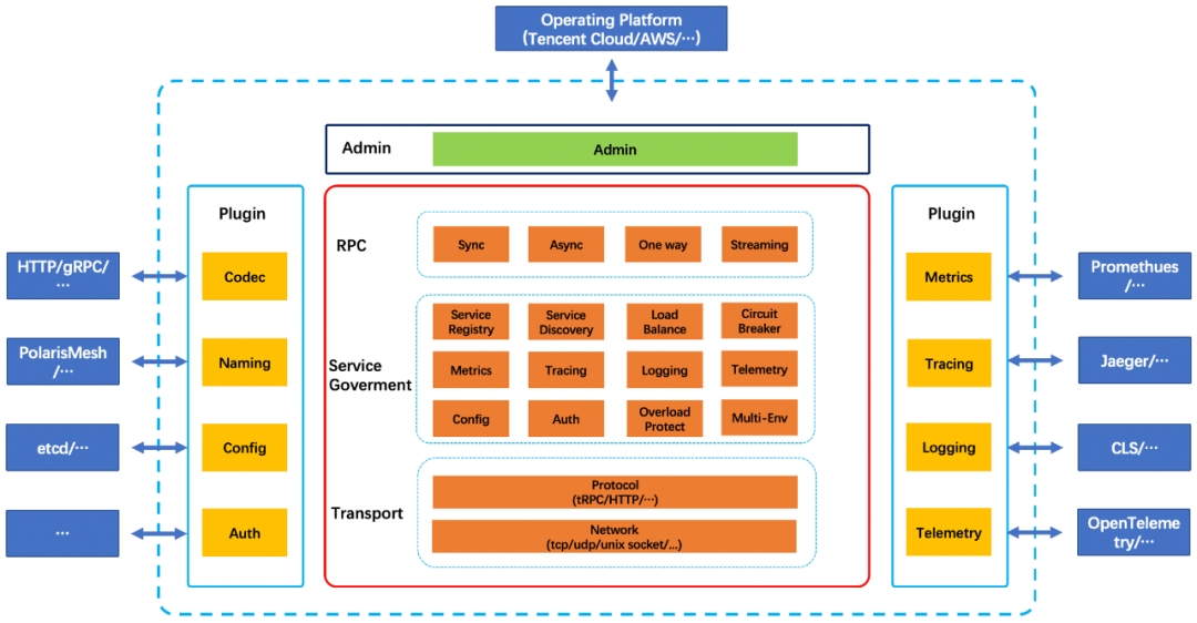 据介绍,tRPC 总体架构由“框架”和“插件”两部分组成,将核心功能抽象封装成一个个独立的插件,其中虚线框内为 tRPC,中间的红色实线框为框架,蓝色实线框为插件部分。