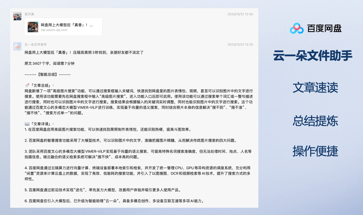 为帮助用户更加高效和便捷地获取知识,百度网盘近期还推出了微信端可使用的“云一朵文件助手”。添加微信企业号“云一朵文件助手”,转发任意公众号文章给云一朵,它就能直接“阅读”,并在10秒内总结、提炼要点,让用户在短时间内获取“精华干货”。