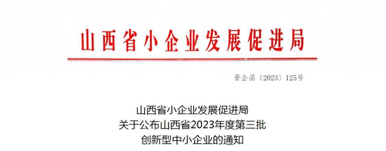 根据《优质中小企业梯度培育管理暂行办法》(工信部企业〔2022〕63号)、《关于印发〈优质中小企业梯度培育管理实施细则(暂行)〉的通知》(晋企发〔2022〕78号)等文件精神,经企业自评申报、各市审核评价、省级汇总等程序,现公布山西晋电电力科技有限公司等225户企业为2023年度第三批创新型中小企业,有效期三年(2023年10月1日至2026年9月30日)。