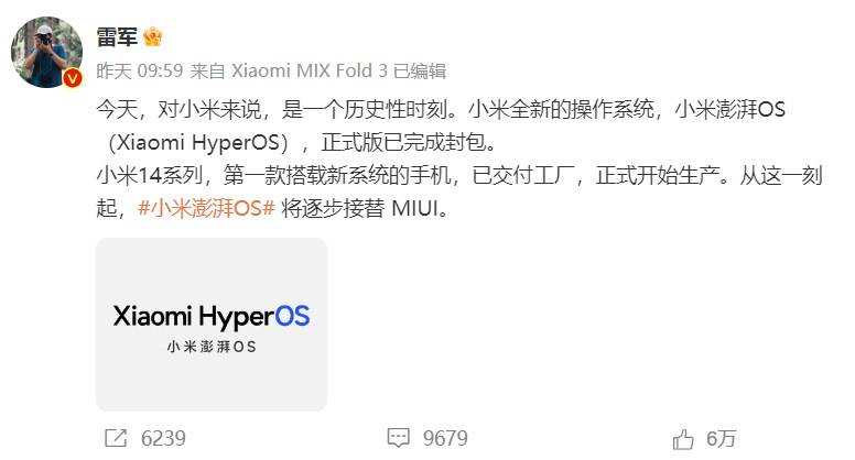 10月17日上午,小米董事长兼CEO雷军发布微博称,小米操作系统——小米澎湃OS(Xiaomi HyperOS)正式版已完成封包。