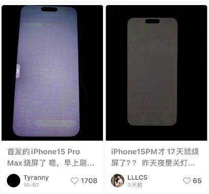 继续讨论烧屏似乎已经失去了意义——尽管它有再多的缺点,我们也一样没得选。让人没想到的是,仅仅发售了一个月,iPhone 15系列突然曝光了大量的烧屏问题。