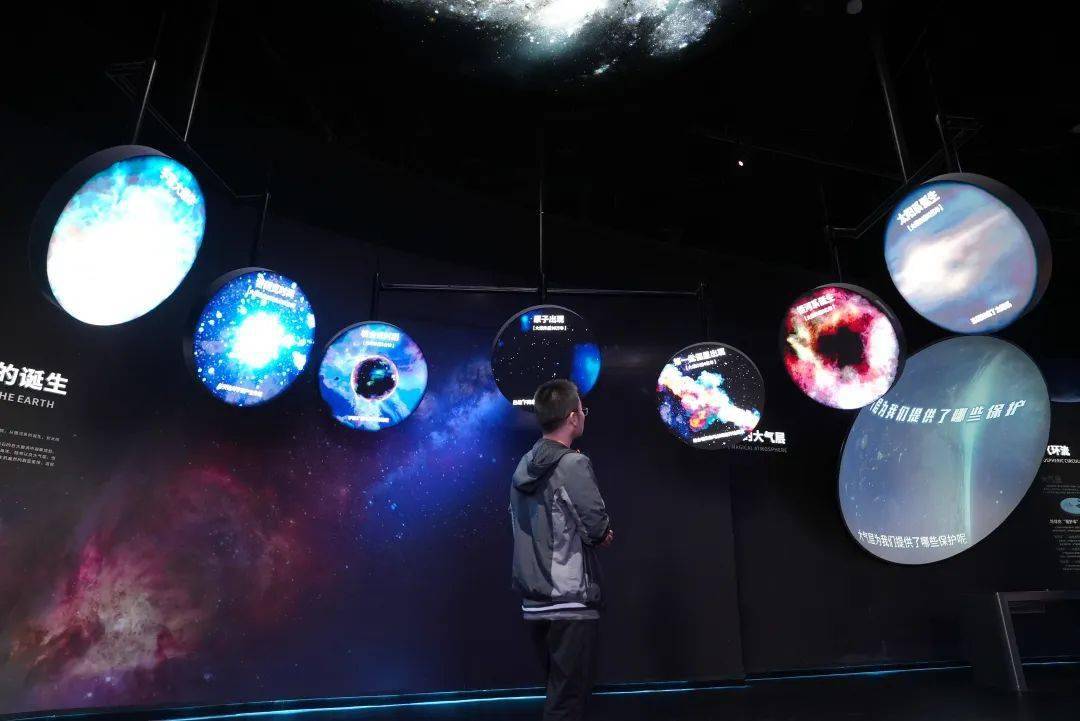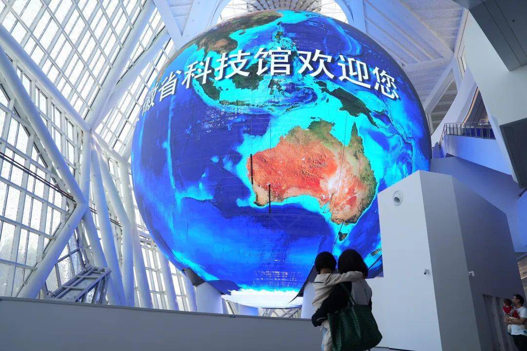 一走进省科技馆新馆,映入眼帘的就是一块悬挂于空中的巨大球形屏幕,屏幕上循环展现着地球、月球、火星等天体表面的模拟画面,还有未来感十足的机械动画,逼真的声光电效果时常让人“恍惚”,忘记这只是一块球形屏幕,在这里拍照“打卡”,绝对“出片”。工作人员介绍,这是目前全国最大的室内LED外球显示屏。