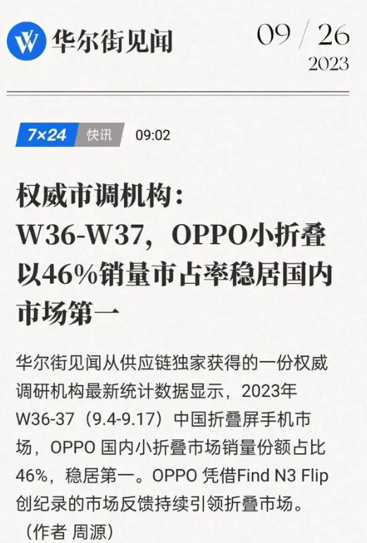 OPPO之所以能够做到环比增长,除了Reno 10系列、Find X6系列等直屏机型的热销,折叠屏的出色表现也是功不可没。要知道作为小折叠屏迭代新款的Find N3 Flip,一经推出便火出圈。在W36-W37期间更是助力OPPO以46%的市场份额,登顶国内小折叠屏市场。