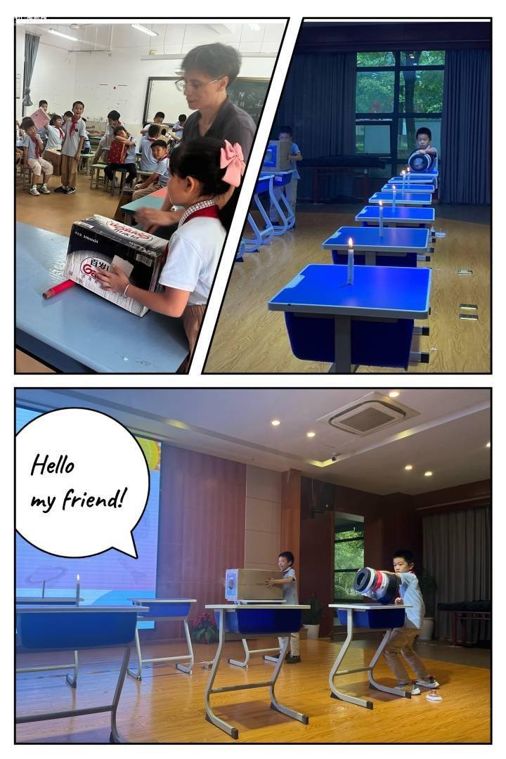 “嘭”只见一个烟圈从纸箱空气炮中发射出来,直直地把6米外的蜡烛吹灭了,同学们发出“哇”的感叹声。制作空气炮不仅可以锻炼我们的动手能力和创造力,还可以促进我们对环保和可持续发展的理解和关注。我们应该珍惜和利用好废旧材料,创造出更多有用的物品,为保护环境和推动社会进步做出贡献。