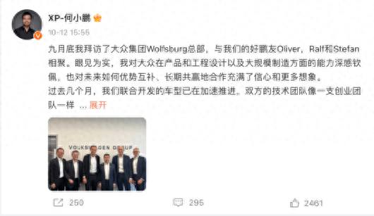 基于双方的合作,何小鹏也在微博发文称其9月底拜访了大众集团狼堡总部,与大众集团CEO、大众中国CEO等成功会面,并表示和大众集团联合开发的车型已加速推进。
