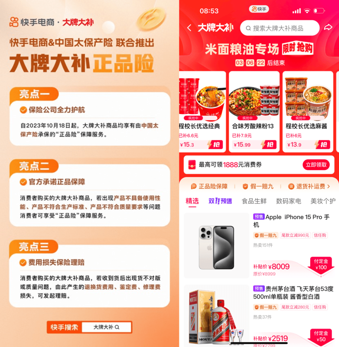 伴随着预售的开启,快手电商同步上线大牌大补商品“正品险”,通过与中国太保产险的合作,提升优化消费者购物体验。当消费者在具备正品险保障的直播间或货架内购买商品后,商品与商家所展示的描述存在差异或存在质量问题时,消费者可与商家协商,对问题商品进行更换、退货或鉴定、修理,由此产生的相关费用,由平台方发起理赔,单次赔偿金额以实际购买商品订单金额为限,累计赔偿限额为1000万。