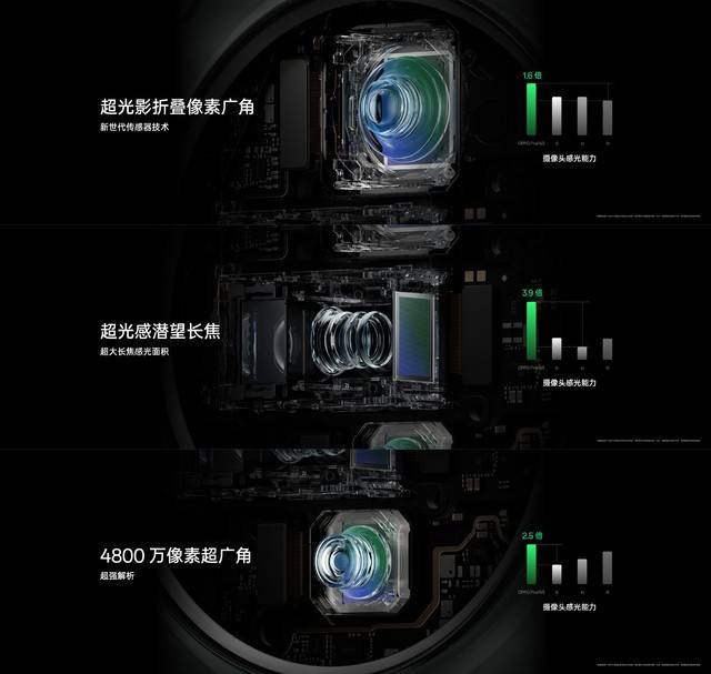 OPPO Find N3在影像配置上搭载了超光影三摄组合,广角镜头为一颗次世代旗舰传感器,4800万像素、1/1.43英寸传感器面积,官方称其画质比肩一英寸大底。