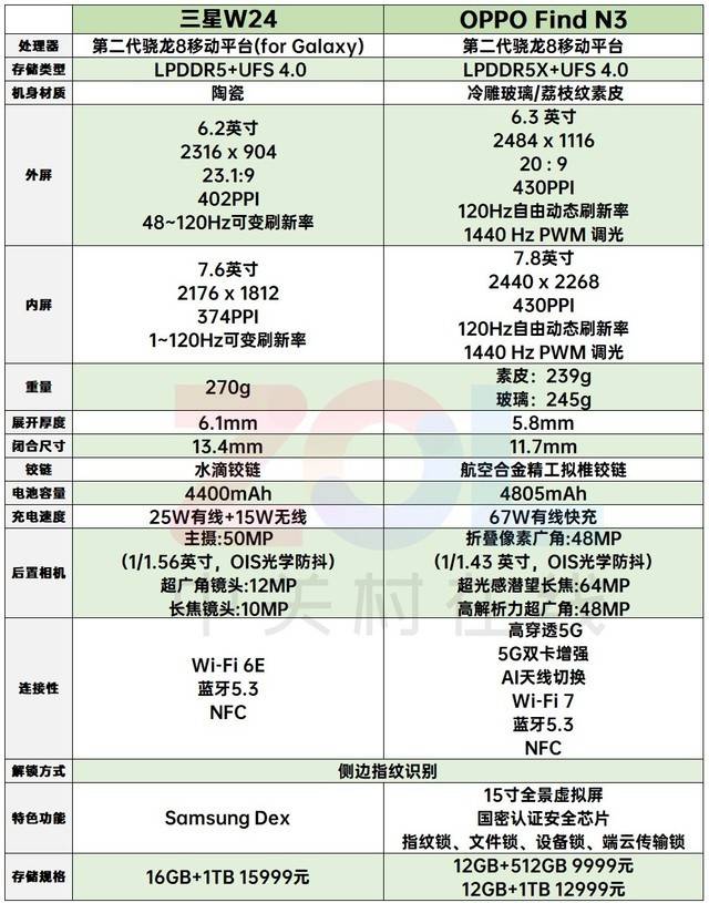 以上便是三星W24和OPPO Find N3在参数上的对比,综合以上分析,两款手机各有优势。