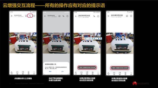 确认该功能处于开启状态后,便可回到图库,找到在普通模式中拍下的人像照片,点击预览,接着便可以看到照片右上角出现了一个类似于魔法棒的标识,点击这个标识即可进行图片优化增强。值得注意的是,首次使用时会出现隐私声明条款,同意后即可正常使用。还有当处于移动网络时,使用该功能会提示流量消耗,非常人性化。