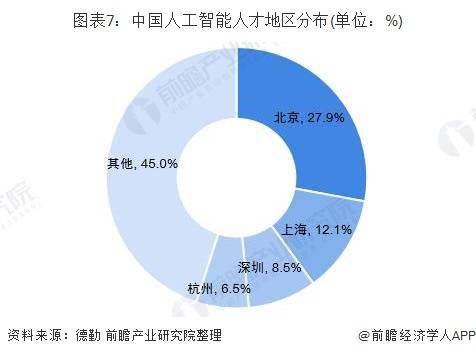 聚焦中国各城市人工智能发展,北京市在该领域遥遥领先。科研院校与机构是人工智能技术研发的重要场所,而北京在这一方面实力雄厚,拥有多所高校。在2018年中国人工智能企业地区分布中,北京占据43.2%的比重,接近一半,其次是上海和深圳,占比分别为14.9%、12.2%,上海也拥有多所高校如交通大学、复旦大学、同济大学等;而深圳则主要依靠企业,如腾讯、华为、中兴等。从人才分布来看,与人工智能企业分布情况类似,前三名仍然是北京、上海和深圳,占比分别为27.9%、12.1%和8.5%。