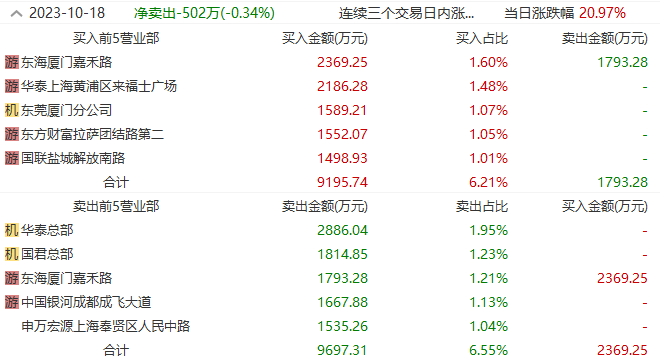 10月18日,上海沪工因连续大涨登上龙虎榜,机构与游资博弈不休。买一席位、知名游资东海厦门嘉禾路同时居卖三席位,“拉萨天团”现身买四席位,提前埋伏的机构资金华泰证券总部与国泰君安总部则逢高卖出。