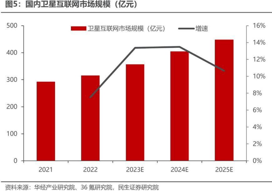 列星随旋,日月递炤。五年后,华为Mate 60 pro+已支持北斗天通双星通讯,海外SpaceX也推出了星链直连手机业务。海内外卫星互联网产业同样呈现快速发展态势,据研究,国内2021年卫星互联网市场规模为292亿元,2022年达到314亿元,到2025年有望达到447亿元。