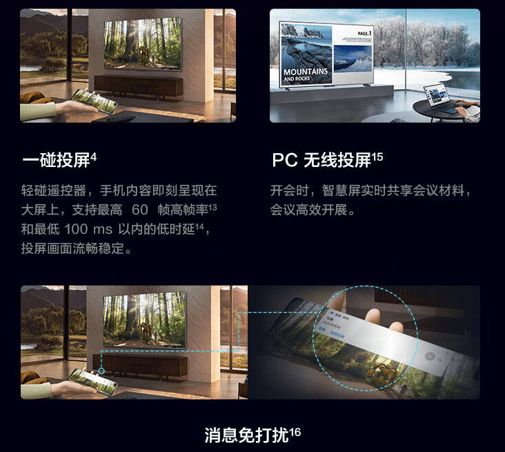 此外,具有手机一碰投屏,支持60帧高帧率画面,还有PC无线投屏,与华为手机、笔记本、音箱可进行丰富的互动。