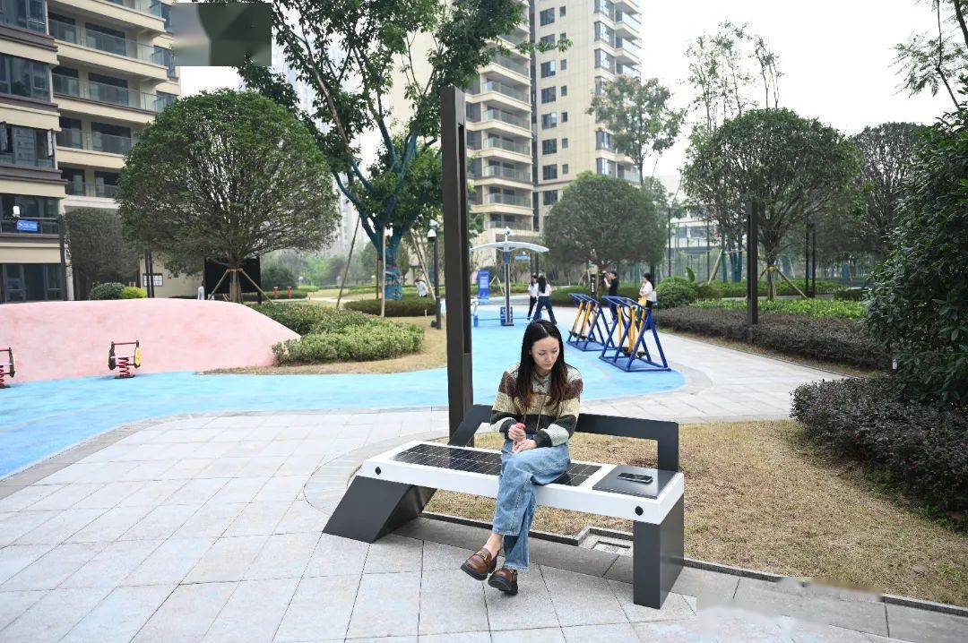 ● 在楼下散步,手机没电又没带充电宝怎么办?小区设置了无线充电座椅,居民平时散步后,不仅能坐下休憩,还可以免费给手机充电。