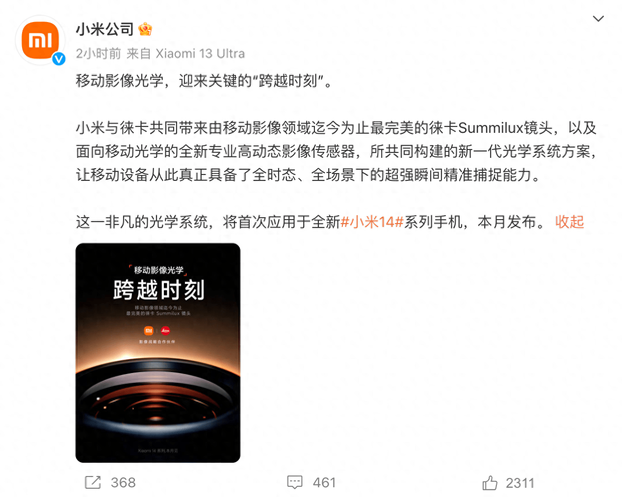 自从小米与徕卡牵手以来,就一直开始不断巩固和提升自己在移动影像领域的地位。而现在全新一代的小米14新机,又将给我们带来新的惊喜。根据小米官方微博的预热信息来看,这次小米将与徕卡继续强强联手,为移动影像领域贡献最完美的徕卡Summilux镜头,再次成为里程碑式的时刻。